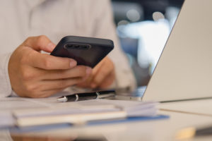businessperson holding a mobile smartphone. work-related activity checking emails, messaging clients or coworkers, or browsing the web for research purposes. concept of technology and communication